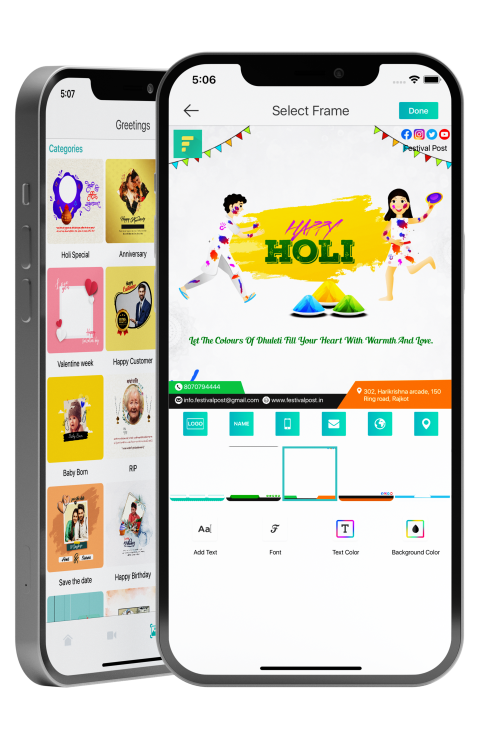 Add your own Photo from Phone Gallery and Set in the Readymade Frame Layout with Company Details like Business Logo, Name, Mobile Number, Gmail ID, Website & Address.